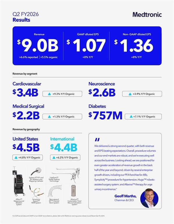 GALWAY, Ireland, Nov. 18, 2025 /PRNewswire/ -- Medtronic plc (NYSE: MDT), a global leader in healthcare technology, today announced financial results for its second quarter (Q2) of fiscal year 2026 (FY26), which ended October 24, 2025.